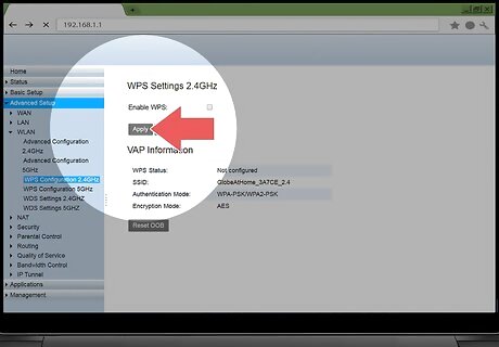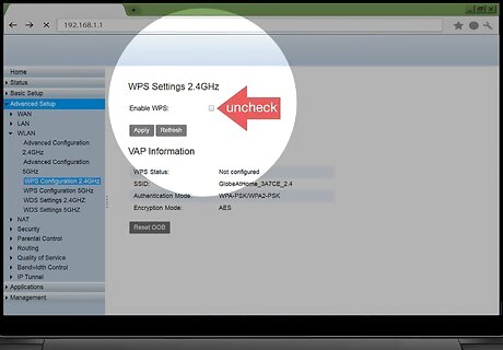 Disable Wi-Fi protected setup. In many cases, this is as simple as checking the "Off" or "Disabled" box next to or below the WPS heading. In some cases, you may have to confirm this decision or enter a password to complete the process.