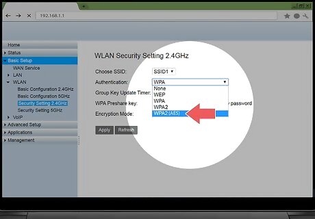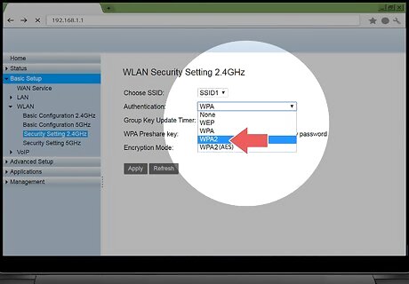Select "WPA2" or "WPA2 Personal" as your security. In most cases, you'll click the "Security Type" (or similar) drop-down box and then click WPA2 or WPA2 Personal in the resulting menu, but your options may vary.