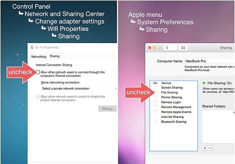 Disable your computer's network sharing. Network sharing allows your computer to share files and information with other computers on the network, but it also makes your computer a weak point in the network's security. To disable network sharing: Windows - Follow these instructions. Mac - Click the Apple menu Mac Apple, click System Preferences..., click Sharing, and uncheck the "File Sharing" box.