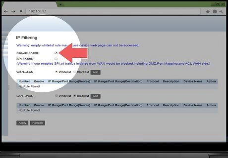 Enable the firewall. In most cases, all you'll need to do to enable the firewall is click the "Enable" or "On" switch or checkbox—your router will take care of the rest. If you see any on-screen instructions appear after doing this, follow them.