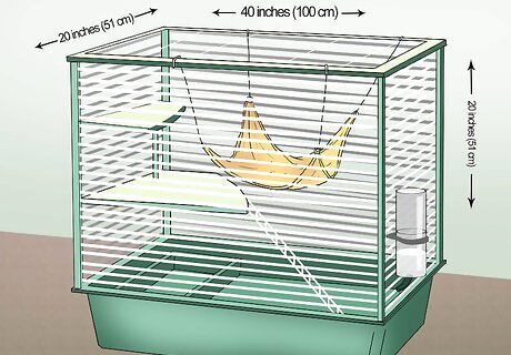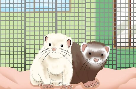 Select a cage that's at least 40 inches (100 cm) by 20 inches (51 cm). Once you spot your ferrets curling up together to cuddle outside the cage, you can move them in together. Find a wire cage that is at least 40 inches (100 cm) wide and 20 inches (51 cm) long, with a height of about 20 inches (51 cm). Bigger is always better though, so buy a larger cage if your space and budget allow for it. If you're raising more than two or three ferrets, consider purchasing a ferret hutch, which is a large enclosure that gives your ferrets extra room to run and climb around.