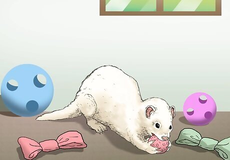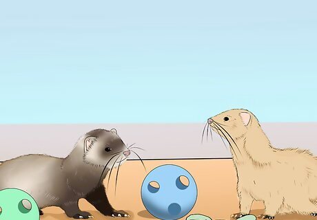 Provide a variety of toys for your ferrets to play with. Ferrets are great at playing together and entertaining themselves, but they still like to play with toys. You can buy toys at pet supply stores, or give them things you already have at home. Offer them empty paper towel rolls, cardboard boxes, golf balls, or plastic balls with bells inside. Supervise them while they play with toys to be sure that they’re not ingesting any shredded materials.