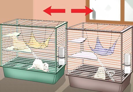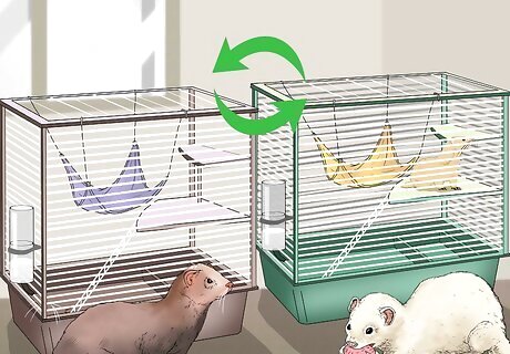 Swap the bedding between the cages for a few days. While your new ferret is getting accustomed to your home, swap some of the bedding amongst all the ferret cages you have. Let your new ferret sleep in its own bedding for a day, then move some of it over to your old ferret’s cage, and vice versa. This will get them all used to each other’s scents before being introduced.
