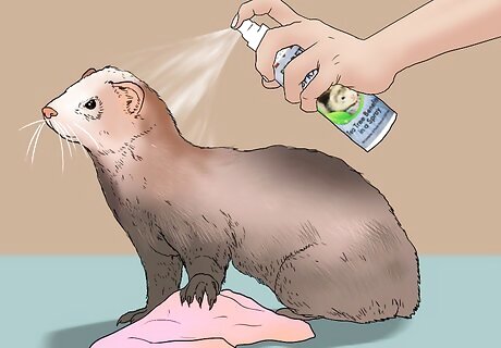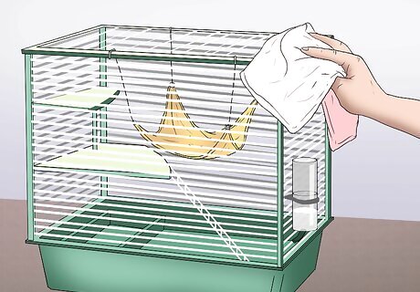 Clean the cage regularly. The more ferrets you have, the dirtier the cage will get. Scoop or replace the litter once a day to remove feces, and change out the bedding once a week. When you change the bedding, wipe down the bars, ramps, and bottom of the cage with a baby wipe or damp paper towel. Give the cage a deep cleaning at least once a year. Spray it down with a diluted bleach solution and then rinse it thoroughly.