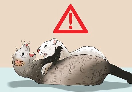 Separate the ferrets if you see signs of fear or violence. Allow them to sniff, wrestle, hiss, and even urinate on the floor to mark territory as they adjust to each other. Step in to separate them only if one continuously runs away in fear or one is clamping down and biting the other’s neck. Start the process over if you see this happening. Swap bedding for a few more days and then try the neutral-territory introduction again.