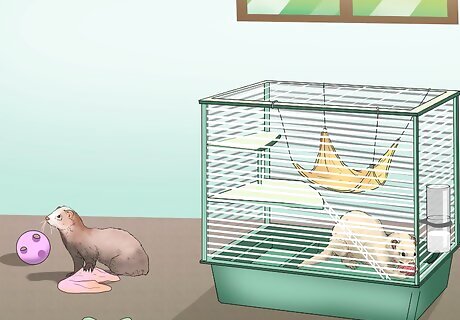 Allow your new ferret to roam the house before letting the old one out. Give your new ferret a few days to get used to its new home before you try to introduce it to any other pets. Keep it in a separate cage in a separate room from your other ferrets, and only allow it into main living areas when your other ferrets are safely shut away in another room.