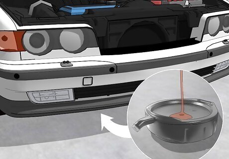 Collect the motor oil in a drain pan when you next go to change the oil. Put a drain pan, or a drip pan, underneath your car to catch the oil. You may also want to put a tarp underneath the drain pan just in case there is any spillage. Make sure the drain pan is clean of other liquids when you use it. Motor oil should never be mixed with things like antifreeze or brake fluid. Many modern drip pans are made specially to be sealed and used to transport oil to be recycled. If you have one of these, there is no need for the original oil container.
