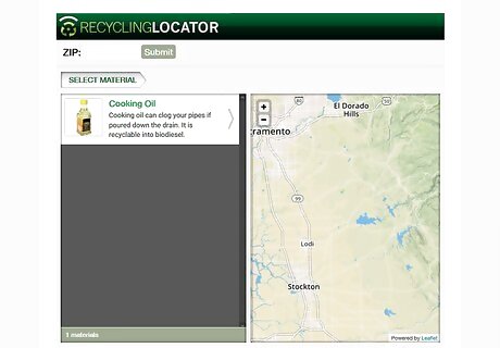 Locate the nearest recycling facility that accepts cooking oil. If there isn’t a facility nearby, check with your local fire department to see if they have a program set up. You could also check with local restaurants to see what they do with their used oil. To search for a location near you, visit https://earth911.com/recycling-guide/how-to-recycle-cooking-oil/#recycling-locator.Warning: Don’t put cooking oil out with your regular curbside recycling.