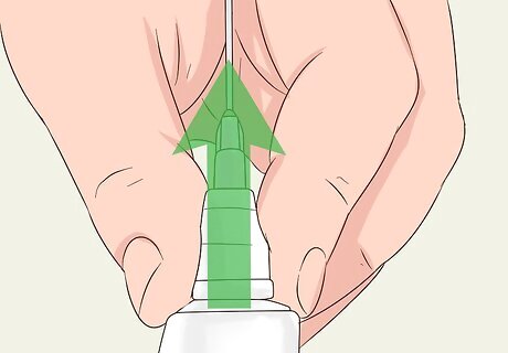 Insert the needle into the open end of the marker. Insert the needle of the refill booster into the opening that was created when you removed the nib. You don’t have to stick it all the way in the marker—just make sure the end of the needle is inside the opening of the marker. Hold the booster with the ink attached vertically over the top of the marker.