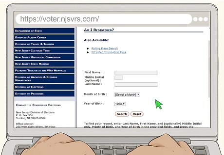 Search online to see if you’re already registered to vote in NJ. Visit https://voter.njsvrs.com/, a site hosted by the NJ Department of State, and fill in the form. Enter your first name, last name, birth month, and birth year, then click “Search.” You’ll then see a list of matching results. If you see your name and county or address, it means that you’ve been registered since the “Voting Privilege Date.” If you don’t see your name, or the search comes up with 0 results, it either means that you’re not registered to vote in NJ, or that your recent registration hasn’t been processed yet.
