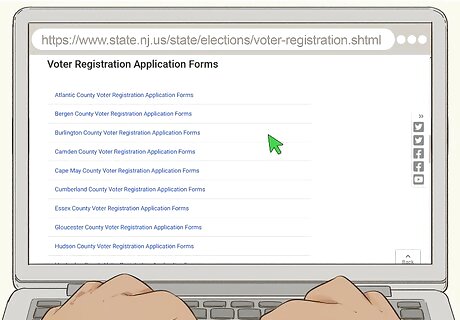 Download the voter registration form for your county. Navigate to https://www.state.nj.us/state/elections/voter-registration.shtml and scroll down to the box labeled “Voter Registration Application Forms.” Look for your county of residence and click on it to download the form. Or you may select the “Statewide Voter Registration Application Form.” All of the forms are available in English and Español, so choose whichever language you prefer. The statewide form is accessible in 12 languages. Select this option, instead of your county form, if you’d like to register in one of these languages. The only difference between the forms is the mailing address printed on each one. County forms are addressed to each location’s County Commissioner, while the statewide form is addressed to the Division of Elections in Trenton.