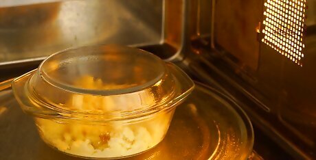 Nuke the potatoes. Transfer your potatoes to a covered, microwave-safe dish. Stir in a small amount of cream to rehydrate them. Cook them in your microwave at half-power for a couple minutes. Uncover the dish, stir your potatoes, and sample to judge the heat. Repeat as needed until your potatoes reach your desired temperature. Use a food thermometer to check the potatoes’ internal temperature; for health reasons, the potatoes should reach at least 165º before they’re safe to eat. Once your potatoes are hot, feel free to stir in some extra cream and butter.