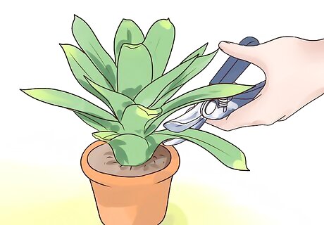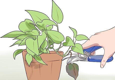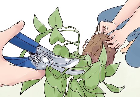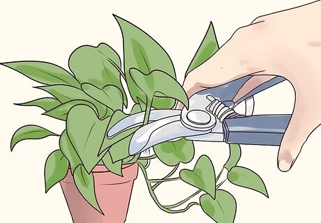 Prune by cutting just above a leaf node. The leaf node is usually a small bump or opening where a leaf or branch comes out of the stem. Try to leave at least some greenery on the plant so it can draw its energy from the sun after pruning.