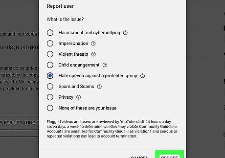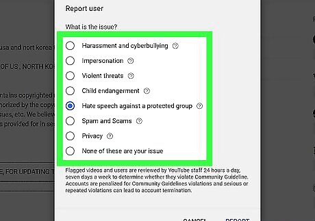 Click REPORT. It's at the bottom of the window. If you choose PRIVACY, or NONE OF THESE ARE YOUR ISSUE, you'll be redirected to a page that displays applicable policies. To report the channel, you'll have to choose a different option.