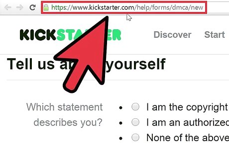 Access the report form. Create a new browser tab and open the Kickstarter Complaint form at https://www.kickstarter.com/help/forms/dmca/new.