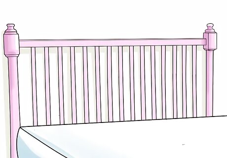 Make a headboard from the side rail. The side rail of a crib is generally the size of a full-sized bed headboard. If you have an old crib that doesn’t meet safety guidelines or a newer crib that you no longer need, you can use the side rail to create a headboard for a full-sized adult bed. Purchase posts from a home improvement or hardware store. You’ll connect these to your side rail for stability. Consider getting posts that not only match your side rail, but that are already sanded. Sand the side rail and then paint it and the posts in a color you like. Let the paint dry and then join the side rail to the posts with dowels. Glue the parts together, clamp them, and let dry for 24 hours. If the rail has a curved side, then it will already look like a nice headboard. The other side of the crib should work well as a footboard so you get a cohesive look.