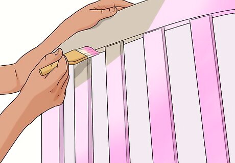 Build a table or bench from the frame. A crib frame presents an excellent opportunity to construct a new table or seating. Remove one long side of the crib and add a stable surface. You can then decorate the unit as a desk, play table, or organization center. Add a mattress for some comfortable seating. Take off either the front or back rail of the crib. These are the long sides of the crib. Secure a stable wood surface to the rails. Paint the table or decorate it another way you like. Keep the bedspring and add a mattress if you want to use the frame as a bench. Make sure to test the crib to ensure that it is stable enough to act as a table or bench. You may need to reinforce it with additional materials if it is not.