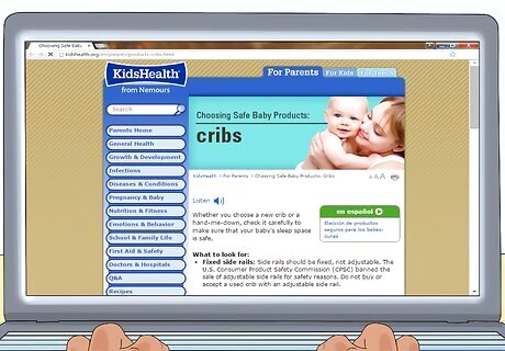 Check the latest safety guidelines. In order to protect babies, governments issue guidelines for safe cribs. Recognize that hand-me-down and used cribs may not meet the latest safety standards. For example, traditional drop-sides increase the risk of suffocation or strangulation. You can find the latest safety guidelines and updates at https://www.cpsc.gov/Newsroom/Multimedia/?vid=61784 and http://kidshealth.org/en/parents/products-cribs.html. Check if there are any recalls for the crib. The US Consumer Protection Safety Commission has an online list of recalled cribs at https://www.cpsc.gov/Recalls?field_rc_date_value%5Bmin%5D%5Bdate%5D=&field_rc_date_value%5Bmax%5D%5Bdate%5D=&combine=cribs.