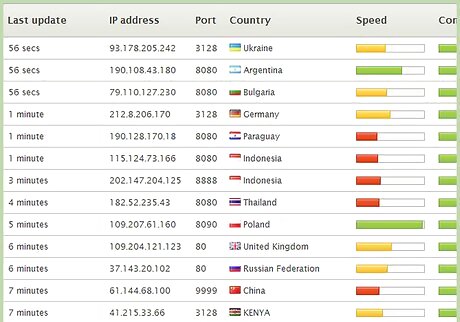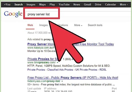 Search on an Internet search engine for "proxy server list." With this method, you reroute your IP address through a proxy server. However, you should beware that although this method is not illegal, using another person's server without their permission is illegal in most countries. Look specifically for an "Anonymous," "Distorting" or "High Anonymity" proxy servers. Anonymous proxy servers do not make your IP address available but they are easy to detect. Distorting proxy servers place a false IP address where your IP address would normally be. High anonymity proxy servers hide your IP address and are not easily distinguishable as a proxy server.