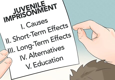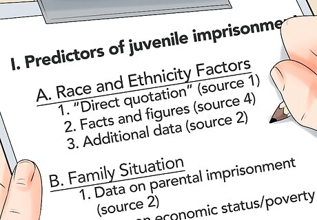 Group your research items. Once you have the flexibility of being able to move the research items physically or within a word processing program, group items together into what will become sections of your paper or project. For example, if you are writing about juvenile imprisonment, you may group your information into “causes,” “short-term effects,” “long-term effects,” “alternatives,” and “education.” For example, a research project on cheetahs may be grouped into “habitat change,” “species information,” “conservation efforts,” and “future predictions.”