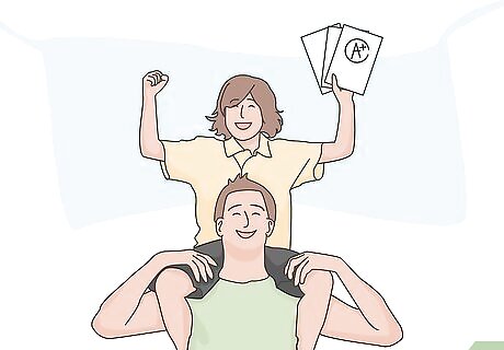 Praise your child for their successes and efforts. Praise your child regularly even if they do not succeed at something they are trying to accomplish. Focus your praise on the work they did rather than an innate quality or what they accomplished. This will help to boost your child's self-esteem. For example, you might say something like, “You worked so hard on your science fair project and I’m so proud of you.” Or, you could say something like, “You were at every single practice this season and you always gave your best effort. Your team is lucky to have you!”