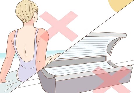 Give up sunbathing and tanning. One of the worst things you can do to your skin is expose it to direct UV light through sunbathing and tanning. You may have already noticed skin damage from your tanning. In the long run, overexposure to the sun can reduce your skin’s elasticity, create blemishes, and make the skin appear leathery. It also puts you at an elevated risk for skin cancer. Avoid tanning outdoors. Sunscreen will not “counteract” the harmful UV rays. Indoor tanning rooms and beds are just as harmful to your skin as natural sunlight. In fact, they can actually produce more concentrated UV rays. If you want a tan, opt for an artificial spray-on or rub-on tan. It is much safer and kinder to your skin.