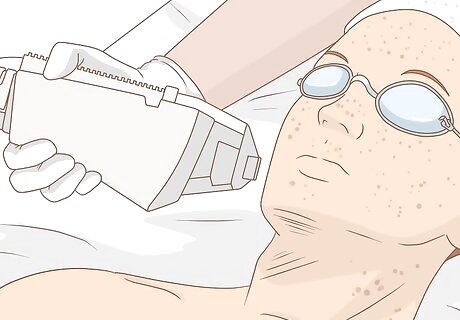 Try a chemical peel or dermabrasion. Chemical peels and dermabrasion are two other ways to renew your skin and to lessen the effects of long-term sun damage. Both involve removing the top layers of your skin and stimulating underlying layers to grow, ideally leading to new, tighter, and younger-looking skin. Talk to a dermatologist about these procedures to see which might work for you. In a chemical peel, a doctor will remove the top layers of your sun-damaged skin with a weak acid. The idea, as in laser treatment, is to encourage the growth of new and younger looking skin cells for smoother skin. Dermabrasion works the same way, but uses an abrasive brush rather than acid. You can get deep dermabrasion or lighter microdermabrasion, which only removes the top-most layer of skin. Be aware that both of these procedures can cause discomfort, redness, or swelling and may take some time to heal. They are often expensive and generally not covered by insurance because they are considered cosmetic-only procedures, not medically necessary procedures.