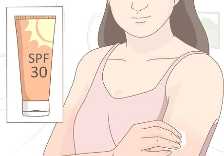 Use sunscreen when outdoors. To prevent more damage to your skin, take basic precautions whenever you go outside. These practices won’t restore your skin to its original condition, but they will keep you from making the situation worse. Your first basic line of defense should be a strong sunscreen. Apply sunscreen liberally whenever you go outside. You should put it on whether or not it is sunny, on all exposed skin. Use SPF 30 or higher. Give the sunscreen at least 30 minutes to absorb into your skin and reapply it every two hours or after going swimming or sweating heavily.