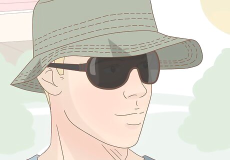 Wear protective clothing. Try to limit your other exposure to direct sunlight, as well. The less total sunlight your skin absorbs, the less damage it will have over the long-term. Use clothing, hats, umbrellas, shade, sunglasses, and other wear for the best protection. Favor loose-fitting garments made from tightly woven fabric, as these offer better protection. Dark colors and dry garments also protect better than light colors and wet clothing. Don a hat — ideally, a wide-brimmed hat — and sunglasses. Try to get sunglasses that block 99% or more of UV and UVB rays. Use shade to your advantage. Also try to do your outdoor activities when the sunlight is not direct, either in the morning or in the later afternoon and evening.