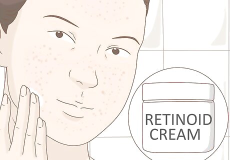 Use a retinoid cream. Retinoid creams are made from vitamin A and usually applied topically to the skin, like Retin-A, Tazorac, Renova, and others. When used in this way, they help you to shed old skin cells and partly restore damaged collagen. Look for them in local pharmacies or ask your dermatologist to recommend one. Be aware that retinoids can make your skin itchy, dry, or scaly. Use them together with a good moisturizer. Topical retinoids can also make your skin more vulnerable to burning, so be sure to combine them with a strong sunscreen (at least SPF 30) and also protective clothing when outdoors.