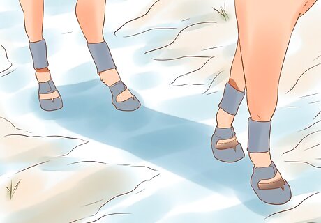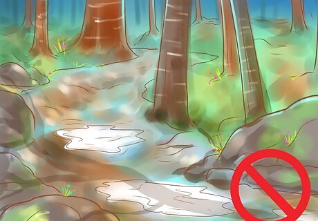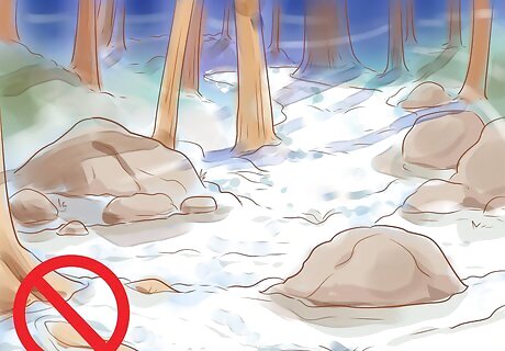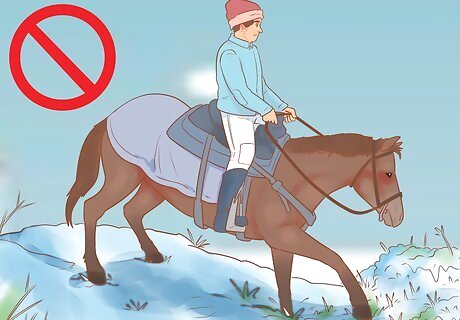 Avoid areas with deep mud. Don’t ride your horse over terrain that's very muddy, as your horse will sink into the mud. Your horse can become stuck and may struggle to walk with mud clumped around its hooves. A thin layer of mud is usually okay. Just pay attention to how your horse is walking to see if it's struggling with the mud. If deep mud is everywhere, you can ride early in the morning when the top layer is hardest. After the sun warms it up, however, riding can be dangerous.