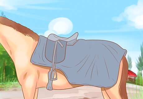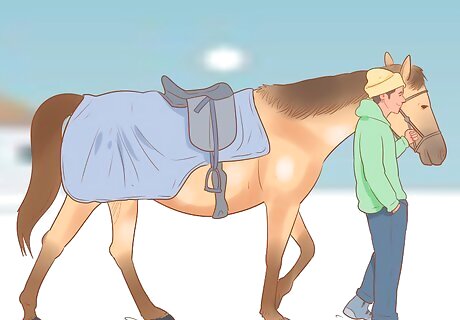 Allow your horse to warm up slowly. Walk it around for a few minutes before you mount. Then, start your trail at a very slow pace. This lets its muscles warm up before your horse starts working hard. To speed up the process, put on gloves and vigorously rub your horse’s legs and back before you tack up.