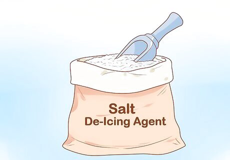 Apply de-icing agents like salt or sawdust to icy or slippery areas. Ash, sand, and grit also make great de-icing agents. Use a wheel barrow or cart to carry the de-icing agent to your stable area, pasture, or trail to treat the ice. Sprinkle the agent over icy surfaces before your ride to help provide traction over the ice. Use your best judgement. If your area is very icy, only ride on the land you treated with a de-icing agent. As another option, you might carry de-icing agent in your saddle bags during your ride just in case you encounter an unexpected patch of ice. Don’t just treat the path where you plan to ride your horse. Put your de-icing agent around the stable, doorway, and tacking area, as well. If your horse will walk there, make sure it’s treated.