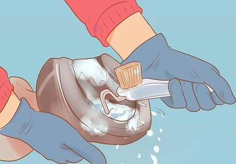Use a hoof pick to remove ice and mud from the hooves, if necessary. Knock any built-up ice or mud off of your horse’s hooves. Then, use the end of the pick to gently clean out any crevices, such as around the horse’s shoes. Ice and mud that remain on the hooves can make it harder for your horse to walk. They can also undermine your horse’s health by increasing your horse’s risk of developing an infection.