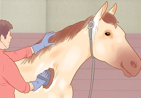 Brush your horse to remove ice, dirt, and mud from the coat. This also helps prevent dirt and debris from building up on the horse’s skin. As your brush your horse, check for wetness so you can dry off your horse if necessary. You don’t want it to catch a chill. Put warm, breathable blankets made from wool or fleece on your horse to keep it warm as you groom it. You might also apply leg wraps.