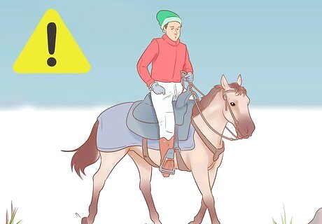 Pick a trail or pasture that doesn't have ice, mud, and other hazards. The biggest dangers for your horse during winter riding include slipping on ice, falling into unseen holes or dips, getting stuck in deep mud, and tripping over hidden obstacles. Make sure your trail is free of these risks before you take your horse out for a ride. It’s best to stick to familiar trails for winter rides, as you’ll know what to expect. You might walk the area if you're riding in your pasture or on a trail near your stables. If walking the area is not an option, talk to other riders to find out where they're riding, as well as the condition of the trails.