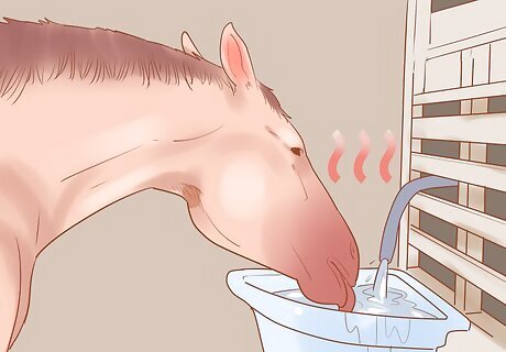 Give your horse water heated to 50 °F (10 °C) to replenish lost fluids. Your horse may easily get dehydrated during the winter. It will still be working hard, plus it may be less likely to drink if the water freezes. Using a water heater will encourage your horse to drink. Warming the water also lowers the amount of calories your horse needs to eat. That’s because your horse’s body will need to warm up cold water to its body temperature, which takes energy. If you give your horse warm water, its body won’t have to warm it.