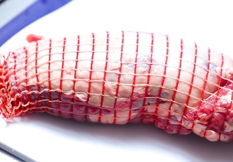 Choose bone-in or boneless. Bone-in lamb, like other bone-in meats, tends to be more flavorful than boneless meat. As the bone cooks it releases juices that flavor the meat. However, bone-in lamb is a bit more difficult to cut than boneless, so you might find it easier to go with the boneless. Boneless meat usually comes in an oven-safe net or wrapped in twine, to keep the meat in the shape of a leg. With the bone, a leg of lamb will weight about 6 1/2 to 8 pounds. If your boneless leg of lamb does not come in an oven-safe net, use kitchen twine to tie the meat together in several spots along its length.