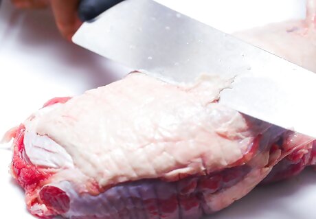 Have the fat trimmed. If the butcher hasn't already trimmed away the fell, a thick cap of fat that encases the leg, have them do so. If you roast the lamb leg with the fell, it will be more likely to taste of mutton, and it will be less tender. However, don't have the butcher remove all of the fat. Keeping some of the fat intact will help to flavor the lamb and keep it moist.