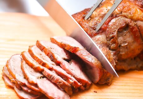 Carve the lamb. If you used boneless lamb, simple cut it into 1-inch thick slices. For bone-in lamb, set the leg on a cutting board. Make perpendicular cuts an inch apart down the length of the leg, using a sharp knife to cut until the knife hits the bone. Stand the leg on its tip and use the knife to cut parallel to the bone so that the meat falls off in slices.