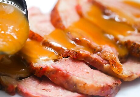 Serve the lamb with sauce. Leg of lamb is traditionally served with a mint sauce or a gravy. The tender meat tastes delicious with a complementary sauce, and these choices don't take much extra time to make. To make mint sauce, blend 2 cups fresh mint leaves, 1/4 cup olive oil, 2 garlic cloves, 2 tablespoons (29.6 ml) lemon juice and 1/4 cup plain yogurt in a blender. Pour over the lamb slices. To make lamb gravy, pour the drippings from the roasting pan into a small saucepan and heat it to medium high. Add 1 chopped onion and sauté until translucent. Add 1 cup chicken stock and 1/2 cup wine, and simmer until it thickens. Season with salt and pepper. Pour over the lamb slices to serve.