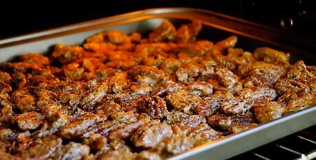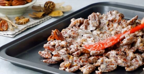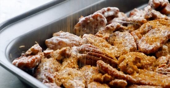 Mix the water and egg whites if you are making sugar roasted pecans. Beat the mixture until it is fluffy. Fold in the pecans to coat them.