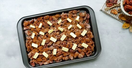 Cut the butter into small pieces. Place them on top of the pecans in even intervals.
