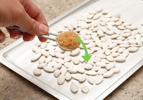 Sweeten your squash seeds. This variation will require a layer of parchment paper along the bottom of your baking sheet. Where you would normally add salt when preparing your roasted seeds, add little to no salt instead. Otherwise, roast your seeds in the traditional fashion previously described. After the seeds have roasted: Allow the seeds to cool. When the seeds have cooled enough to be touched with your hand, add a small amount of brown sugar or maple syrup to the seeds. Add other spices to create a dynamic taste. Sweetened seeds are great with spices like cinnamon, allspice, nutmeg, or a combination of these. Mix the seeds to evenly distribute your sweetener and any other spices you've added. After that, roast the seeds for another 10 minutes or so, until the sugar starts to melt.