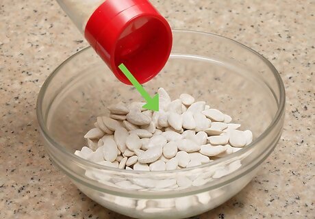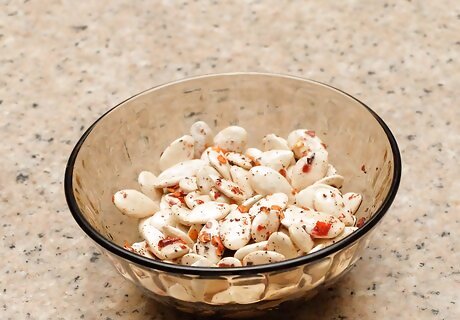 Season your seeds with oil and salt. Now that you've measured how many seeds you'll be making, you're ready to season them. For every ¾ cup of seeds, add 1 teaspoon of oil and several pinches of salt to the seeds. If you prefer your squash seeds to be on the saltier side, you may want to use as much as half a teaspoon of salt in your seasoning. Those who dislike strong, salty flavors may want to only use a single pinch of salt to season the seeds.