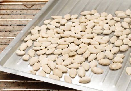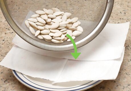 Dry the seeds. Lay out enough paper towel to accommodate your seeds on a flat, clean surface of your counter. Then, take your colander and carefully upend the seeds on the paper towel. After that: Take some more paper towel and pat the seeds dry. Some seeds may stick to the paper towel. Pick or knock these free with your fingers or a utensil. You can prevent seeds or seasoning from dirtying your baking sheet by lining the bottom of your baking pan with either aluminum foil or parchment paper.