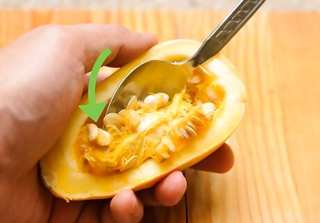 Remove the seeds from your squash. Take a sharp knife and cut the squash so that you have access to the innards in the bulb of the gourd. The shape of your squash will dictate the best cut. In most cases, halving the gourd down or across the center will be sufficient. Then: Use a spoon or your hand to tear out the seeds of the squash. These will likely be slimy with gourd guts. Place the seeds in your colander. Once you have removed as many seeds from the squash as you desire, run cool water over the seeds in the colander to clean them. Use your fingers to remove any remaining gourd innards from the seeds. Then shake the colander firmly over a sink or drain to remove excess water.
