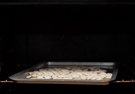 Bake the seasoned seeds in your oven. At this point, your oven should be preheated and ready to roast your seeds. Take the sheet and insert it into your oven. You'll need to watch your seeds as they cook. Ideally, just as the seeds begin to brown, they should be removed from the oven. For most ovens, it will take about 20 to 25 minutes for the seeds to start browning. However, hot weather or an overheated kitchen can decrease this time. To ensure a consistent roasting of your seeds, take your spatula and stir the seeds after 10 minutes have passed.