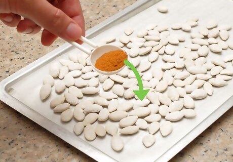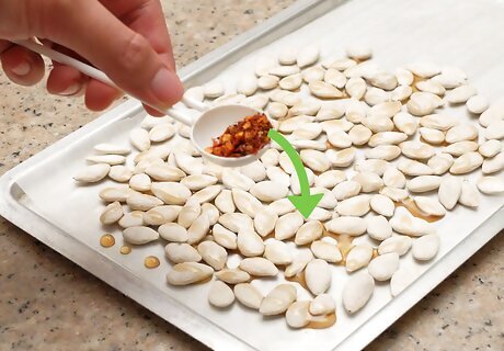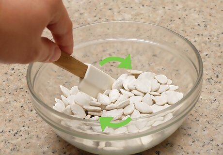 Mix the seeds to distribute the seasoning. Much like you would toss a salad to evenly distribute its ingredients, so too should you mix your seeds so the seasoning is evenly spread throughout. Once the seeds are mixed: Use your hands or a utensil, like a spatula, to spread the seeds in a single layer on the pan. Seeds that are stacked or overlap may emerge from the roasting process slightly under cooked.
