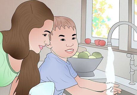 Teach children how to wash their hands. Kids and adults of all ages are constantly putting their fingers and hands into their mouths, noses, and eyes. This spreads germs of all kinds, both good and bad. Teach your children the proper way to wash their hands. They should wash them for at least 20 seconds (have your child sing the "Happy Birthday" song twice to teach the proper length of time), while scrubbing under their nails and using lots of sudsy soap. Children should wash their hands: Before eating Often when she or anyone she is in contact with is sick After using the toilet In crowded places like stores, malls, theaters, and parks If they are clearly dirty